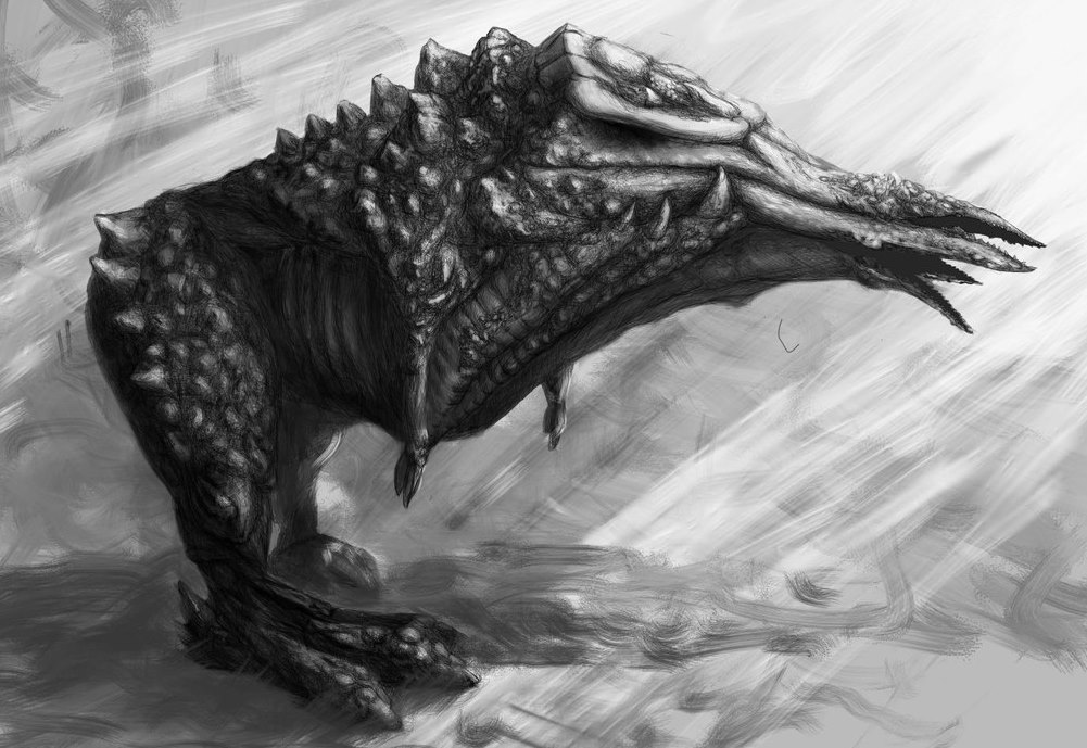 Передние лапы сильно атрофированы и выглядят как небольшие зачатки будущих лап. Тело же было покрыто какими-то наростами, с такого расстояния даже через оптику было плохо разобрать, но очень похоже на роговые наросты. Морда же была вытянута конусом вперед, с широко расположенными на ней узкими щелочками глаз. На месте, где должна быть пасть, свисали какие-то щупальца.