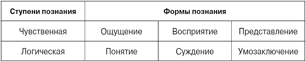 Человеческая познавательная деятельность осуществляется как двухуровневый процесс на ступени чувственного познания (живого созерцания) и на ступени абстрактного мышления, которое с определенным допущением можно назвать логической ступенью или ступенью рационально-логического познания. Каждая ступень (уровень) познания имеет по три характерных для нее формы: ощущение, восприятие, представление – для чувственности; понятие, суждение, умозаключение – для логического мышления (см. табл. 1).
