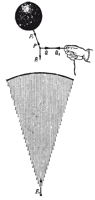 Пусть вы рассматриваете (рис. 5) силы P, Q и R, которые действуют на грузик, подвешенный к детскому воздушному шарику. Тяга Р шара, тяга Q верёвочки и вес R грузика – силы как будто одиночные. Но это лишь отвлечение от действительности; на самом деле для каждой из трёх сил имеется равная ей, но противоположная по направлению сила. А именно сила, противоположная силе Р, приложена к воздушному шарику (рис. 6, сила Р1); сила, противоположная силе Q, действует на руку; сила, противоположная силе R, приложена в центре земного шара (рис. 6, сила R1), потому что грузик не только притягивается Землёй, но и сам её притягивает.