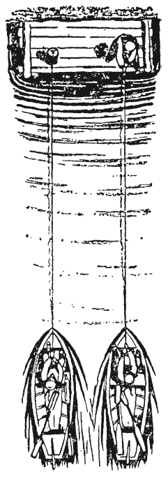Но верно ли, что на эту лодку действует двойная сила? Если и лодочник, и матрос оба тянут к себе верёвку, то натяжение верёвки равно силе только одного из них – иначе говоря, оно таково же, как и для первой лодки. Обе лодки подтягиваются с равной силой и причалят одновременно[12].