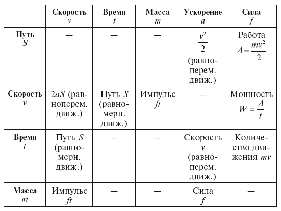 Пустые клетки таблицы показывают, что произведения соответствующих величин не имеют в механике никакого смысла.