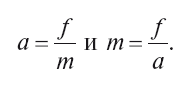 Сила f, делённая на массу m, равна ускорению а; делённая же на ускорение а, равна массе m:
