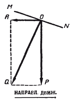 Мы подвержены тогда действию двух сил: силы R, направленной обратно движению вагона, и силы веса Р, прижимающей нас к полу. Равнодействующая Q изобразит то направление, которое мы в таком состоянии будем считать отвесным. Направление MN, перпендикулярное к новому отвесу, станет для нас горизонтальным. Следовательно, прежнее горизонтальное направление OR будет казаться поднимающимся в сторону движения поезда и имеющим уклон в обратном направлении (рис. 22).