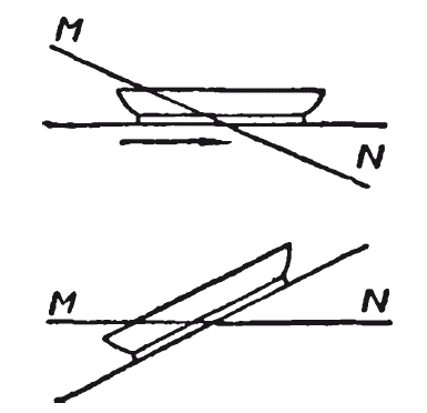 Что произойдёт при таких условиях с жидкостью в тарелке? Для этого представим себе, что новое «горизонтальное» направление не совпадает с уровнем жидкости, а следует (рис. 23) по линии MN. Это наглядно видно на рисунке, где стрелка указывает направление движения вагона. Теперь ясно, почему вода должна вылиться через задний край тарелки (или дождевого жёлоба).