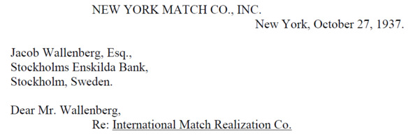 Г-н Якоб Валленберг рассказал мне о Вашем плане установления контактов с авторитетными кругами в Турции и с лицами, имеющими голос в принятии окончательного решения о покупке турецкой спичечной фабрики и приобретения монопольных прав на спичечную продукцию. Он отметил, что назвал Вам мое имя в этой связи. Как я понимаю, Ваш г-н Луис Э. Стерн может взять на себя ответственность за переговоры. Мой дед, Густав Оскар Валлен-берг, долгое время являвшийся послом Швеции в Турции, после ухода в отставку занимался этим вопросом с высокопоставленными турецкими должностными лицами и, без сомнения, был бы рад Вам помочь, если бы не умер в начале этого года. Он много занимался этим вопросом со своим другом в Кабинете министров, а также с другими своими друзьями среди должностных лиц и их советников. Я знаю одного-двух заинтересованных лиц и владею его перепиской по данному вопросу. Посол Валленберг не только пришел к частичному пониманию с несколькими влиятельными лицами, но также получил официальную письменную гарантию от правительства. Благодаря его отличным связям и знанию местных условий, особенностей восточных бизнес-методов, он значительно продвинулся вперед. Эта проблема особенно интересна для меня, поскольку я знаю Левант из посещения Турции и моей работы в Хайфе, в Holland Bank Union. Я готов предоставить в Ваше распоряжение связи моего деда и мои собственные связи, чтобы достичь благоприятного результата. Для этого мне понадобится поехать в США позднее в этом году, но до этого я мог бы заехать в Стамбул, если пожелаете. Если захотите со мной связаться, письма и телеграммы лучше направлять по моему вышеприведенному стокгольмскому адресу.