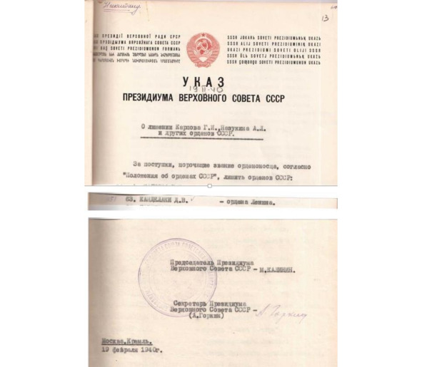 Указ Президиума Верховного Совета СССР о лишении Канделаки ордена Ленина