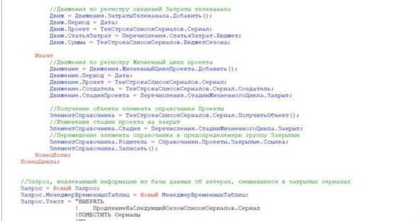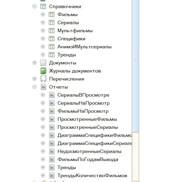 Целью программиста при создании самописной конфигурации для учёта просмотренных фильмов было создание справочников, их форм, реквизитов и табличных частей (на примере справочника «Фильмы» реквизиты «Год выхода», «Просмотрен», «Дата просмотра», «Специфика», «Оценка»), чтобы пользователь мог в режиме «1С: Предприятие» создавать элементы данных справочников, и создание отчётов, с помощью которых пользователь может видеть данные из элементов справочников в определённых разрезах, которые нужны ему. Отчёты созданы с помощью запросов 1С – этот механизм позволяет получать данные из базы 1С (разница между конфигурацией и базой: конфигурация – программа, написанная на 1С; база – место хранения данных, основанное на определённой конфигурации). Запросы 1С похожи на SQL-запросы, только имеют русский синтаксис. Тестируют запросы в режиме «1С: Предприятие» на реальных данных с помощью специальной обработки «Консоль запросов».