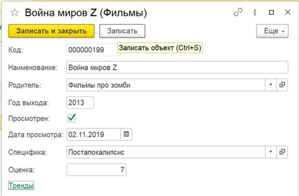 Элемент справочника «Фильмы» в режиме «1С: Предприятие»