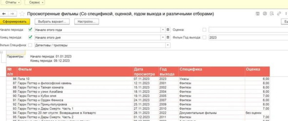 Отчёт Просмотренные фильмы в режиме «1С: Предприятие»