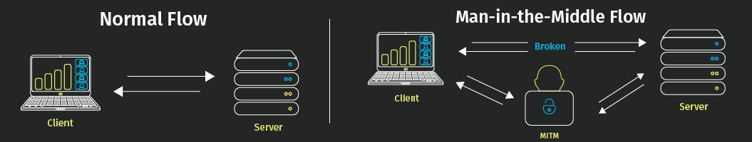 Если вы подключены к публичной Wi-Fi сети, злоумышленник может легко перенаправить весь трафик между вашим устройством и роутером через свой ноутбук, тем самым он получит доступ ко всем данным, которые вы передаете или загружаете. Для этого злоумышленник будет использовать MitM-атаку (“человек посредине”) – ARP-spoofing.