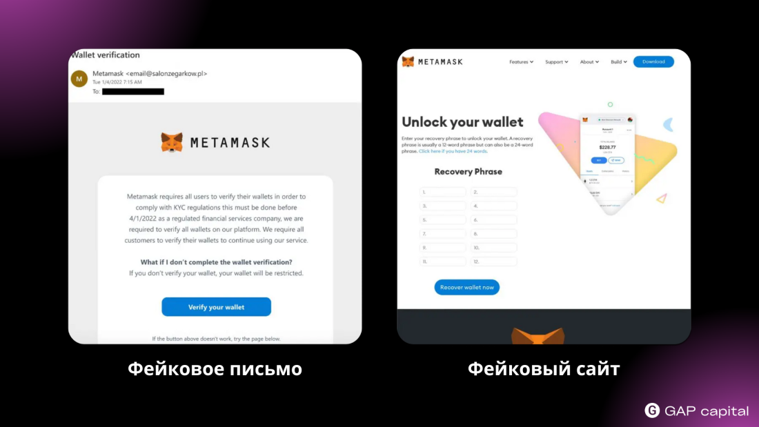 Адрес сайта отличался всего одной буквой. Жертвы фишинговой атаки не заметили отличия и потеряли доступ к своим кошелькам, поэтому будьте крайне бдительны, когда переходите по незнакомым ссылкам.