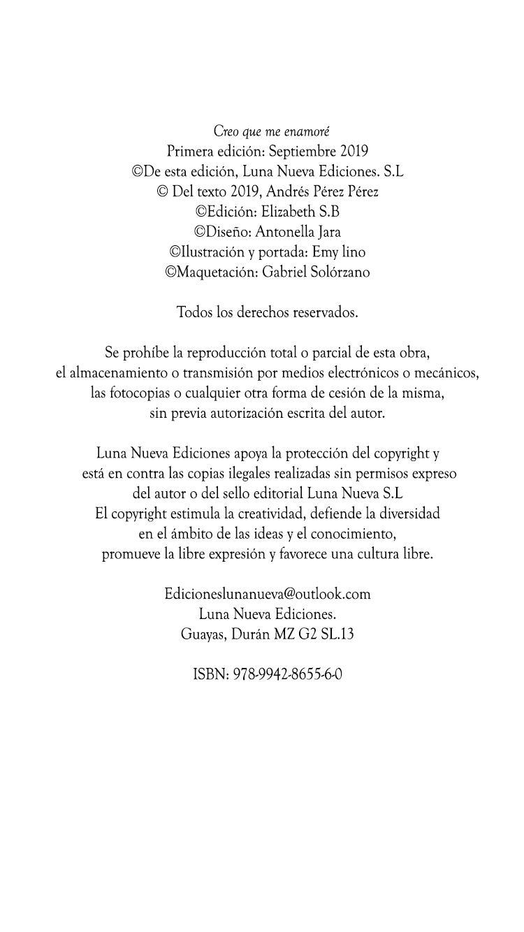 Este libro se basa en una historia real, no obstante, los sucesos narrados y sus escenarios, en su mayoría son ficticios.