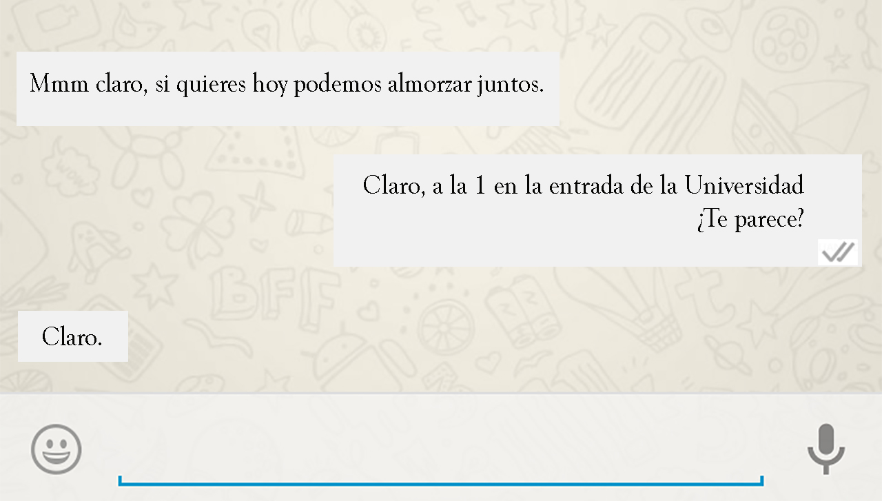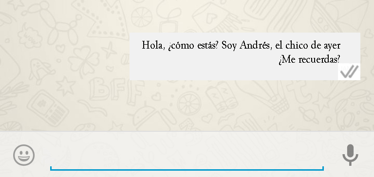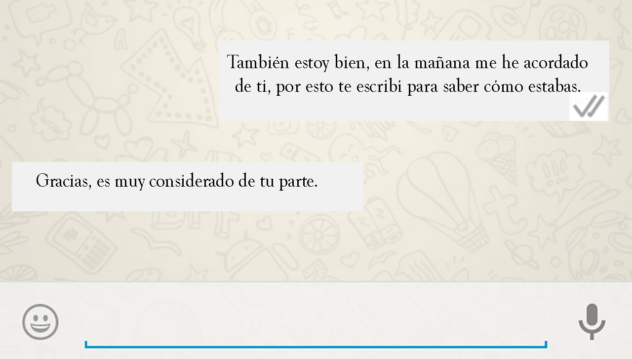 Traté de ser lo más atento posible, miré dos veces el mensaje y presioné el botón de enviar. Guardé rápidamente el teléfono, el corazón nuevamente se me aceleró, no era para menos, acabé de enviar el codiciado mensaje que tanto había planeado, esperé un tiempo sensato antes de revisarlo nuevamente y traté de entender de lo que se trataba la clase. Veinte minutos después hice el mismo proceso para adquirir el móvil, lo revisé, y sí, se encontraba una notificación por explorar. Me emocioné nuevamente y comprobé que el mensaje si era de ella.