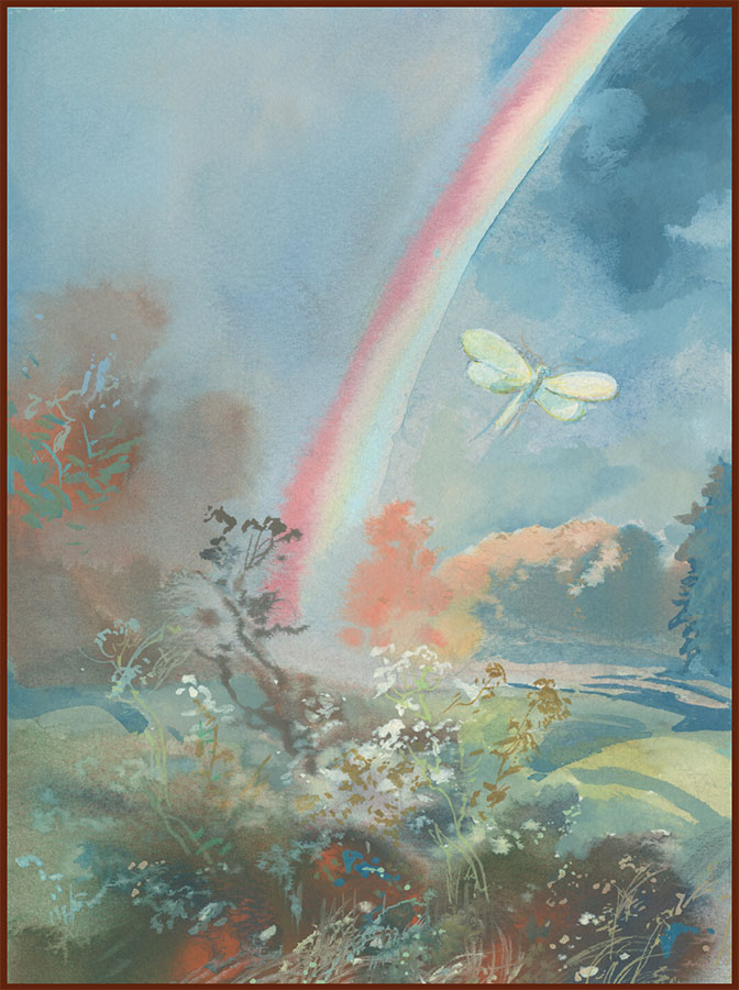 Поселил Тушкан Белую Бабочку в своей шёрстке. Куда он, туда и она. Ему хорошо, а ей того лучше. Живёт Белая Бабочка в тепле, в светле, в мягкости. Одно только Тушкану непонятно: как можно вместо завтрака цветы нюхать, солнечным лучом обедать и алой зарей ужинать. А спрашивать не стал.