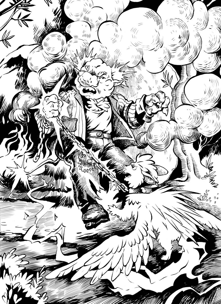 Собрав энергию внутри себя в один большой импульс, бесенок выплеснул ее всю и сразу. Цепь, за которую держался тролль, вспыхнула. Сразу же раздался хлопок, и из кулака Ютула брызнули искры. Не издав ни единого звука, тролль рухнул лицом вперед.