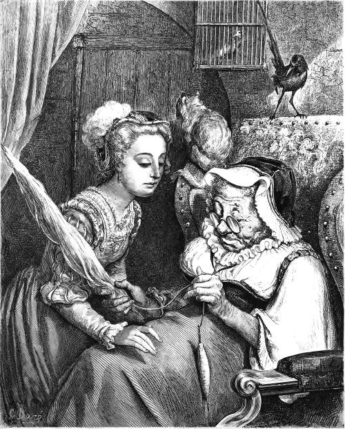 Прошло пятнадцать или шестнадцать лет, и король с королевой отправились как-то в один из своих увеселительных замков. Принцесса, гуляя однажды по замку из комнаты в комнату, забралась наверх в башню, а там на чердаке сидела за прялкой, совсем одна, какая-то старушка. Эта славная женщина ни слова не слышала о королевском запрете.