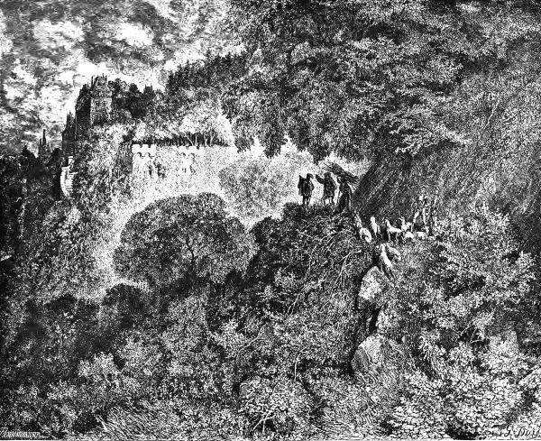 Прошло сто лет, и сын короля, который в то время царствовал, бывший из другого рода, чем спящая принцесса, поехал в ту сторону на охоту. И тут он спросил, что это за башни, которые виднеются из-за густого леса. Каждый ему отвечал то, что сам слышал: один говорил, что это старый замок, навещаемый духами; другой – что там все окрестные колдуньи справляют свой шабаш. Но большинство говорило, что это жилище людоеда и что он туда уносит всех детей, которых ему случается изловить, чтобы там на досуге их съесть, и его никак нельзя выследить, так как он один умеет прокладывать себе дорогу через тот лес.