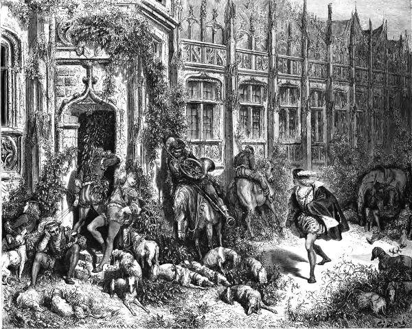 Он вошёл в передний двор и, оглядевшись, чуть было не застыл от страха. Вокруг было ужасное молчанье, повсюду виднелись картины смерти, лежали распростёртые тела людей и животных, казавшиеся мёртвыми. Но он скоро заметил по прыщеватым носам и красным лицам привратников, что они только спали, а их кубки, в которых ещё оставалось немножко вина, указывали, что заснули они выпивая.