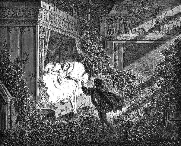 Он пересекает большой двор, вымощенный мрамором, поднимается по лестнице, входит в залу стражи; она стоит там, выстроившись в ряд, ружья на плече, и храпит что есть мочи. Он проходит через покои, полные кавалеров и дам, которые все спят, кто стоя, кто сидя; вступает в опочивальню, всю позолоченную, и видит перед собой на ложе, занавеси которого подняты со всех сторон, прекраснейшее явление, какого он никогда не видел: принцессу, лет пятнадцати-шестнадцати на вид, лицо которой так сияло, что можно было подумать, что это свет божественный. Он подошёл, дрожа и любуясь, и опустился перед ней на колени.