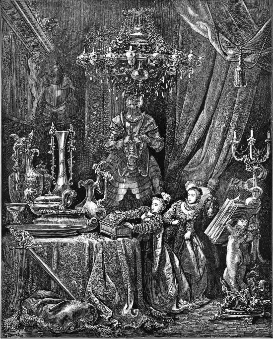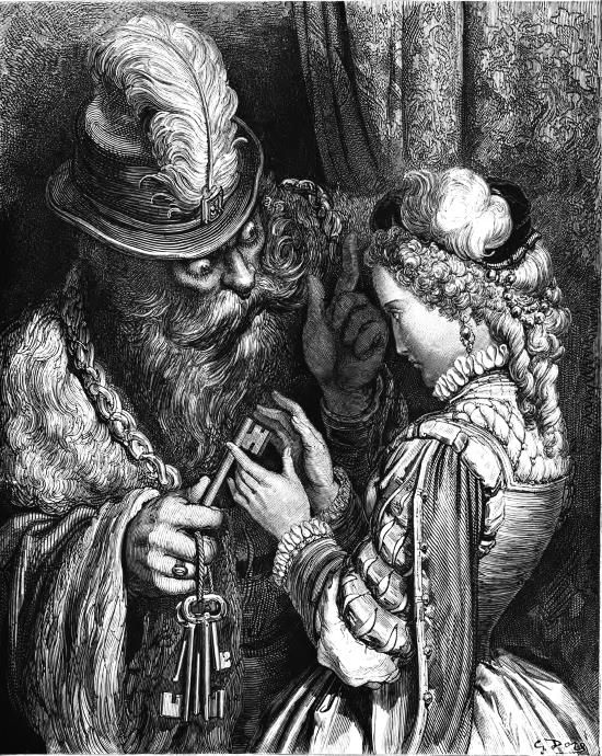 – Вот, сказал он, – ключи от двух больших мебельных кладовых, вот ключи от серебряной и золотой посуды, которую не подают каждый день; вот ключи от моих сундуков с золотом и серебром и от ларцов с драгоценными камнями; а вот ключ, который отпирает все двери в замке. Ну, а этот маленький ключ – это ключ от комнаты в конце большой галереи нижних покоев. Отворяйте все двери, ходите повсюду, но в эту комнатку я вам запрещаю входить, и запрет мой таков, что если вы меня ослушаетесь, то можете ожидать моего гнева.