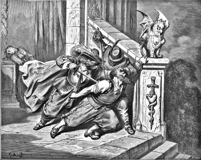 Тот узнал братьев своей жены, одного – драгуна, другого мушкетёра, и тотчас же обратился в бегство, чтобы спастись. Но оба брата бросились за ним и настигли его раньше, чем тот добежал до крыльца. Они пронзили его своими шпагами насквозь, и он упал бездыханный. Бедная женщина находилась почти в таком же состоянии, как и её муж, и не в силах была подняться, чтобы обнять братьев.