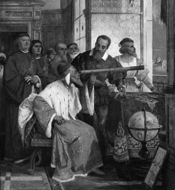 Рис. 5. Галилео Галилей показывает венецианскому дожу, как пользоваться телескопом. Фреска Джузеппе Бертини. 1858 год. Вилла Андреа Понти, Варезе (Италия).