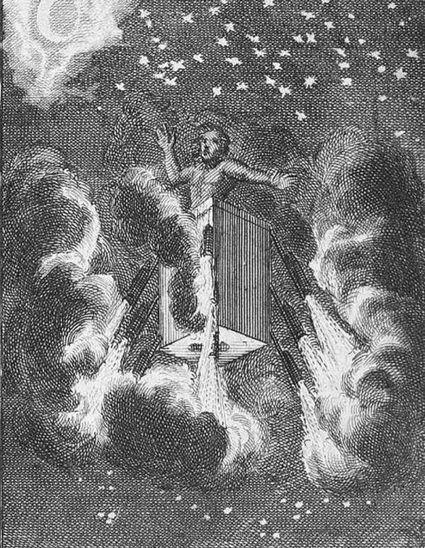 Рис. 8. Полёт Сирано на Луну при помощи пороховых ракет. Иллюстрация Лоренца Шерма из первого тома собрания сочинений Сирано де Бержерака, изданного в Амстердаме. 1710 год.