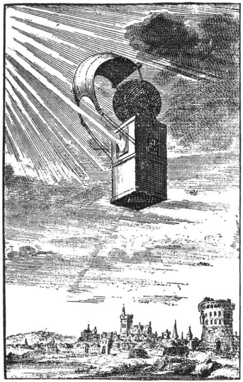 Рис. 9. Полёт Сирано на Солнце при помощи специальной машины. Иллюстрация Лоренца Шерма из второго тома собрания сочинений Сирано де Бержерака, изданного в Амстердаме. 1710 год.