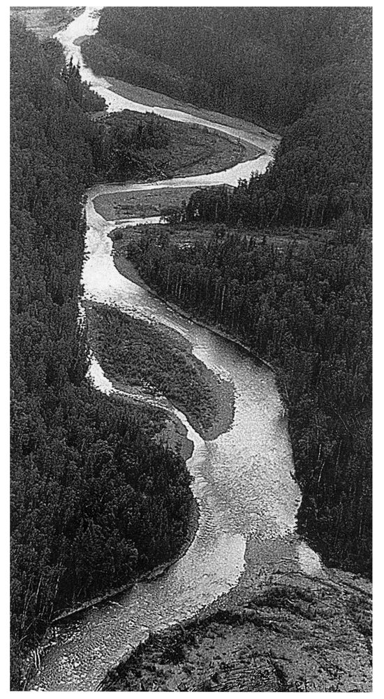 Двадцатого сентября под вечер вертолет, поднявший метель из желтых березовых листьев, сел на косе. Мы выпрыгнули на обкатанные водою белые камни, выгрузили поклажу. Вертолет упругим вихрем еще раз тряхнул верхушки берез и скрылся за скосом горы. Осенний огненный мир, два часа проплывавший внизу, теперь обступал, подымался от ложа реки круто вверх. По желтому густо-темным цветом темнели кедры и ели, малиновыми пятнами обнаруживали себя рябины. После холодного и ненастного лета в абаканской тайге стояла нарядная ясная осень. Было тепло и тихо. Синее небо отражалось в непривычно спокойной воде. Где-то кричала кедровка. И это был единственный звук, напоминающий о скрытой под пологом леса жизни.