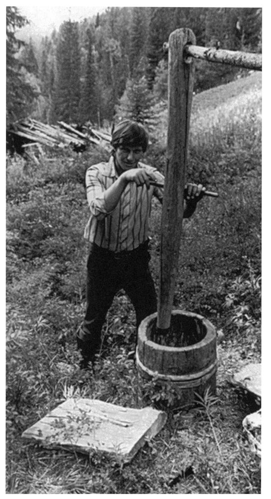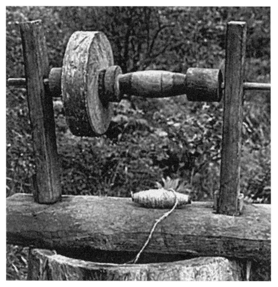 Ступа. Обратите внимание на «механизацию»: пест висит на упругой сосновой жерди, и его не надо поднимать вверх – сам подпрыгивает