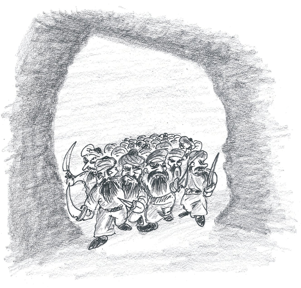 Da reden die Richtigen! Schurke, Bosheit, Verderben – davon müssten diese Männer eigentlich am meisten verstehen, haben sie sich doch mit der Zeit einen ordentlichen Haufen an Reichtümern erbeutet, die sie in ihrem Geheimversteck lagern. Ein frei stehender Felsen ist es, der praktischerweise eine Tür hat, die – noch praktischer – auf die Worte »Sesam, öffne dich!« reagiert. Warum das so ist, das ist nicht aus dem alten Indien über Persien und Syrien zum französischen »Entdecker« (oder gar Verfasser?) der Geschichte, Antoine Galland, durchgedrungen. Profiräuber muss man sein, oder Glück muss man haben.