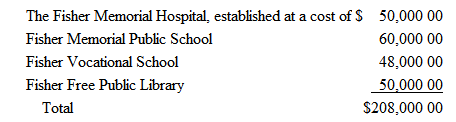 Lewis Peter Fisher, of Woodstock, was for years an active Trustee of the Carleton County Grammar School, and a strenuous advocate of Free School Education. He had no children. By his will he left his large fortune to establish a number of institutions of an educational and philanthropic character in the town of Woodstock, the affairs of which he had long ably administered as mayor. These institutions include: