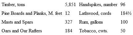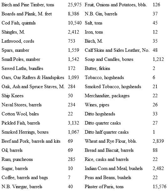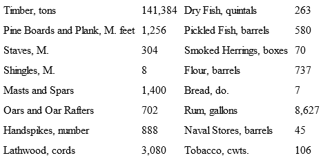 Exports To Great BritainSquared timber, masts, spars, oars, lathwood, deals, furs, &c. Ship-building forms also a considerable branch of trade at present. Some of which are built by contract for merchants in Great-Britain, and others are built and loaded by merchants in the Province, and either employed by them in the exportation of lumber, or sold in Britain. The returns for this trade are British merchandise, and specie.