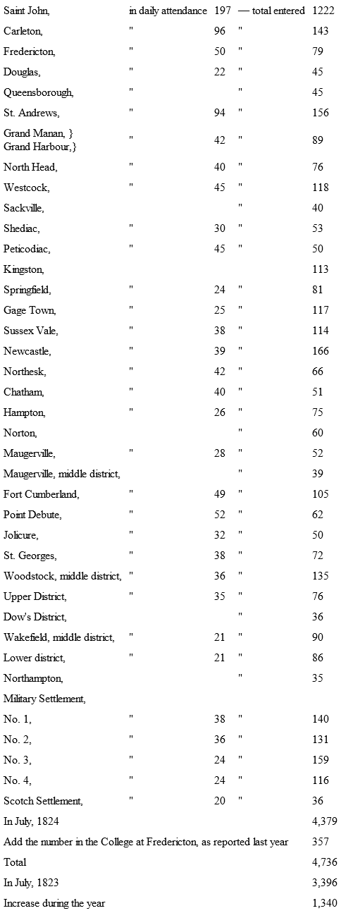 The most general seminary for the education of the bulk of the population is the Madras School. The Lieutenant-Governor and a number of the first characters in the Province, have the management of this seminary, which is incorporated by the name of "The Governor and Trustees of the Madras School in New-Brunswick." As most of the Parish Schools in the Province are on the Madras system of education, and under the direction of the corporation, I shall close this short sketch of the state of learning in this Province with a statement of that institution copied from the last report.