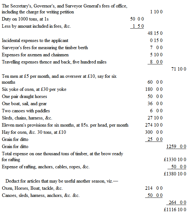 The preceding statement points out the necessity of adopting a more prudent system in conducting the timber business. Not to push the trade to such an extent – to retrench the expenses, by raising the heavy parts of the supplies near the timber districts; and to follow up the timber trade with the improvement of the country and cultivation of the soil.