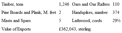 From the foregoing statement it plainly appears that chief of the export trade of this Province consists of timber, which is its natural stock or capital; and as there are many articles taken in exchange from the mother country, which are indispensably necessary to the inhabitants of this Province; it points out the necessity of paying strict attention to its preservation. In this Country there is no article, or articles, that can in any degree furnish exports equal to the pine, which is manufactured in the simplest manner, and got to market with but little trouble. So simple is the process that most settlers who have the use of the axe can manufacture it; the woods furnishing a sort of simple manufactory for the inhabitants, from which, after attending to their farms, in the summer, they can draw returns during the winter for those supplies which are necessary for the comfort of their families. This being the case, the preservation of our forests becomes of prime importance to the prosperity of the Province.