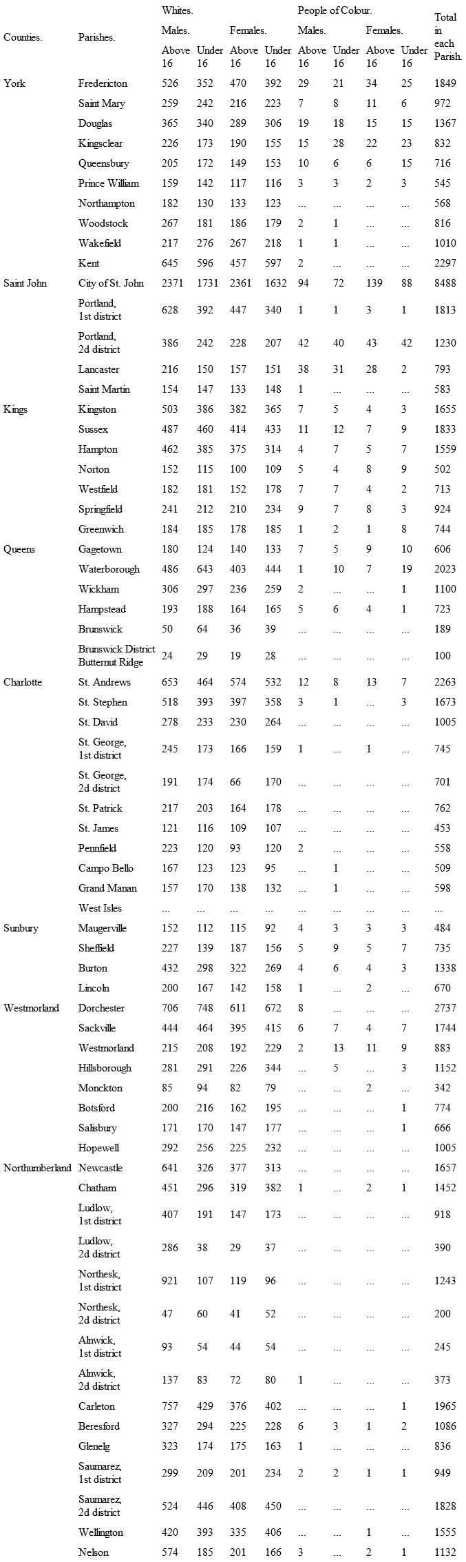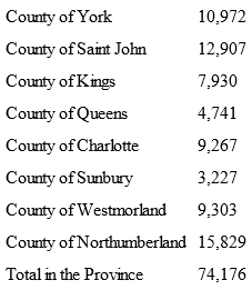 The number of inhabitants in this Province, according to the census of last year, is seventy-four thousand one hundred and seventy-six – besides the large settlement of Madawaska and the parish of West Isles; and as it is probable the numbers in the different parishes are taken in some instances under the real amount, the whole population may be fairly rated in round numbers at eighty thousand. The subjoined statement will show the population of the different counties and parishes in 1824: