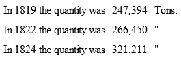 As squared timber is the great staple of this trade, I shall set down the number of tons exported yearly at three different periods, from which the reader may form a pretty correct idea of the quantity usually shipped in a year.