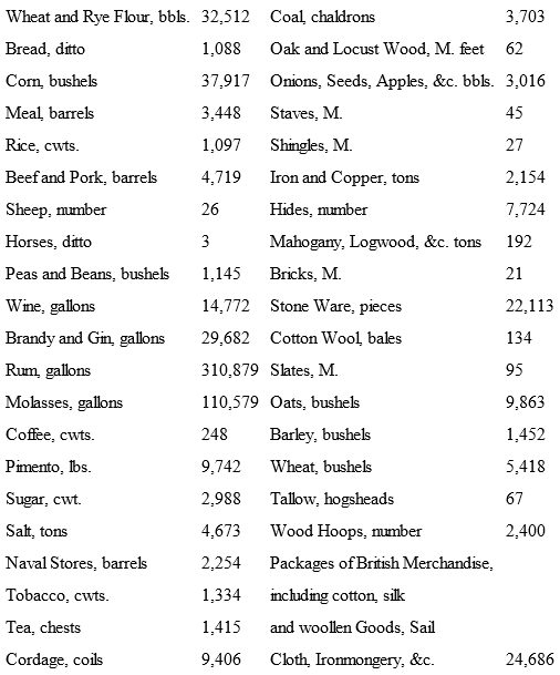 There was formerly a considerable trade carried on with the United States in gypsum, grindstones, smoked salmon, &c. and for a short period in the productions of the West-Indies from the free port of St. John, (as well as from Halifax in Nova-Scotia.) But the trade in West-India produce is now totally at an end, and the other branches much fallen off, so that most of the flour, corn, and bread stuffs imported from thence is paid for in specie, which is a great drain for the cash of the Province: for there are nearly sixty thousand barrels of wheat and rye flour, and from sixty-five to seventy thousand bushels of indian corn, imported annually, besides corn meal, bread, &c.