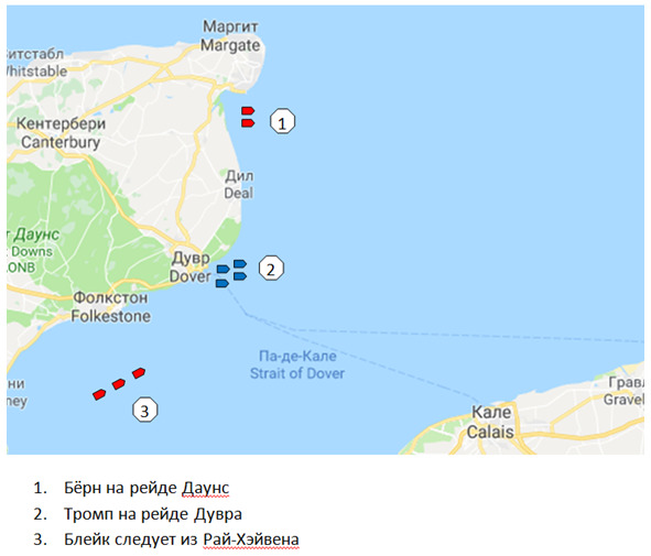 «Эндрю» (флагман) – 56 орудий«Триумф» – 62 орудия«Фэйрфакс» – 52 орудия«Энтранс» – 44 орудия«Эщуранс» – 40 орудий«Эдвенчур» – 36 орудий«Центурион» – 36 орудий«Севен Бразерс» – 26 орудий«Грейхаунд» – 20 орудийСостав эскадры Тромпа