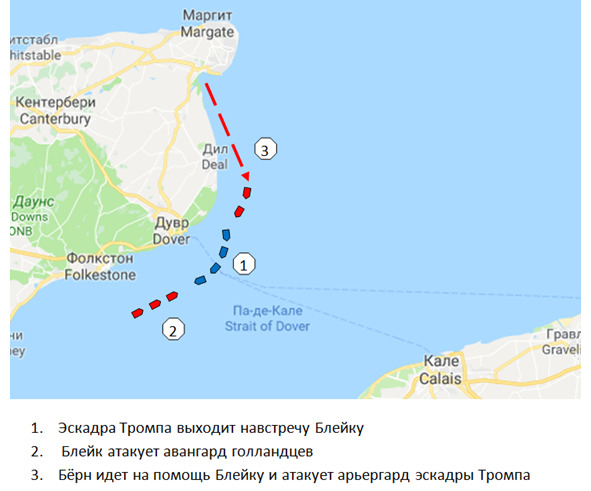 Флагманский корабль Блейка «Джеймс» двинулся к флагману голландцев «Бредероде» и, принуждая того отсалютовать приспусканием флага, произвел первый выстрел под форштевень корабля Тромпа. Видя, что никакой реакции не последовало, Блейк дал второй выстрел по развевающемуся кормовому флагу голландского корабля, а третье ядро послал в борт «Бредероде».
