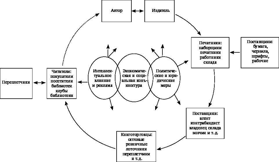 [Он] пролегает от автора к издателю (если эту роль не берет на себя книготорговец), печатнику, грузоотправителю, книготорговцу и читателю. Читатель завершает цикл, потому что он оказывает влияние на автора как до, так и после написания произведения4.