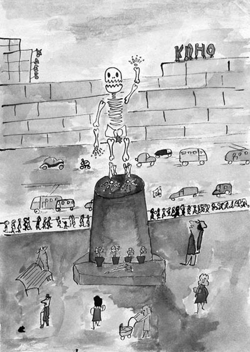 Особенность макабрического рисунка Аронзона (ил. 1.) не столько в том, что здесь «высмеивается» советская реальность, сколько в том, откуда направляется взгляд невовлеченного в регулярность социального энтузиазма, а сам смотрящий пытается «осилить» «молчание страшного мира» с его неподвижностью и разобщенностью и находит для этого особую позицию – вненаходимости, отрешенности, благодаря которой обнаруживает в себе состояния интенсивной жизни и глубокого обмирания.