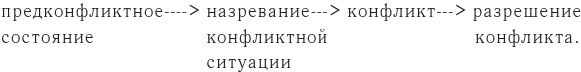 Некоторые исследователи конфликта не придают значения такому его «узлу» как предконфликтное состояние, преувеличивают импровизационный характер конфликтной ситуации. Вызревание конфликтной ситуации рассматривается как кратковременный момент10. При этом не учитывается органическая связь данного периода развития конфликта с предконфликтным состоянием, которое уже сигнализирует о возможности конфликтной ситуации. Между тем, именно на этой стадии – стадии предконфликта – возможно достичь оптимального управления дальнейшим развитием ситуации, предугадать её последствия.