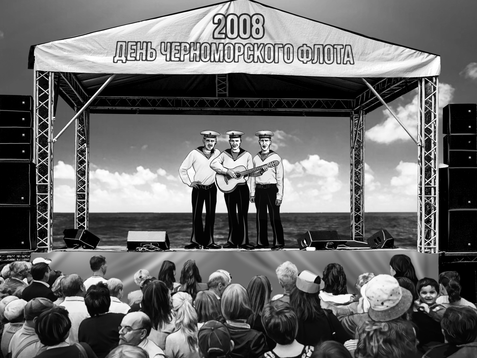 Но потом остыл и дал добро. На следующий день мы с гитарой и пухлым женоподобным мичманом поехали на концерт. Но поворот к ДК мы проехали и направились к площади, находящейся рядом с крейсером «Михаил Кутузов». Когда мы увидели, сколько там народу, я захотел сразу домой, под одеялко. Вся площадь была забита людьми, видимо, вышел весь город. Оказалось, что это один из любимейших праздников новороссийцев. Посередине стояла сцена, где ведущий развлекал народ. Выйдя из автомобиля, мы сразу закурили, так как не ожидали многотысячную толпу, и вдобавок я еще с фингалом под глазом, просто образец моряка.