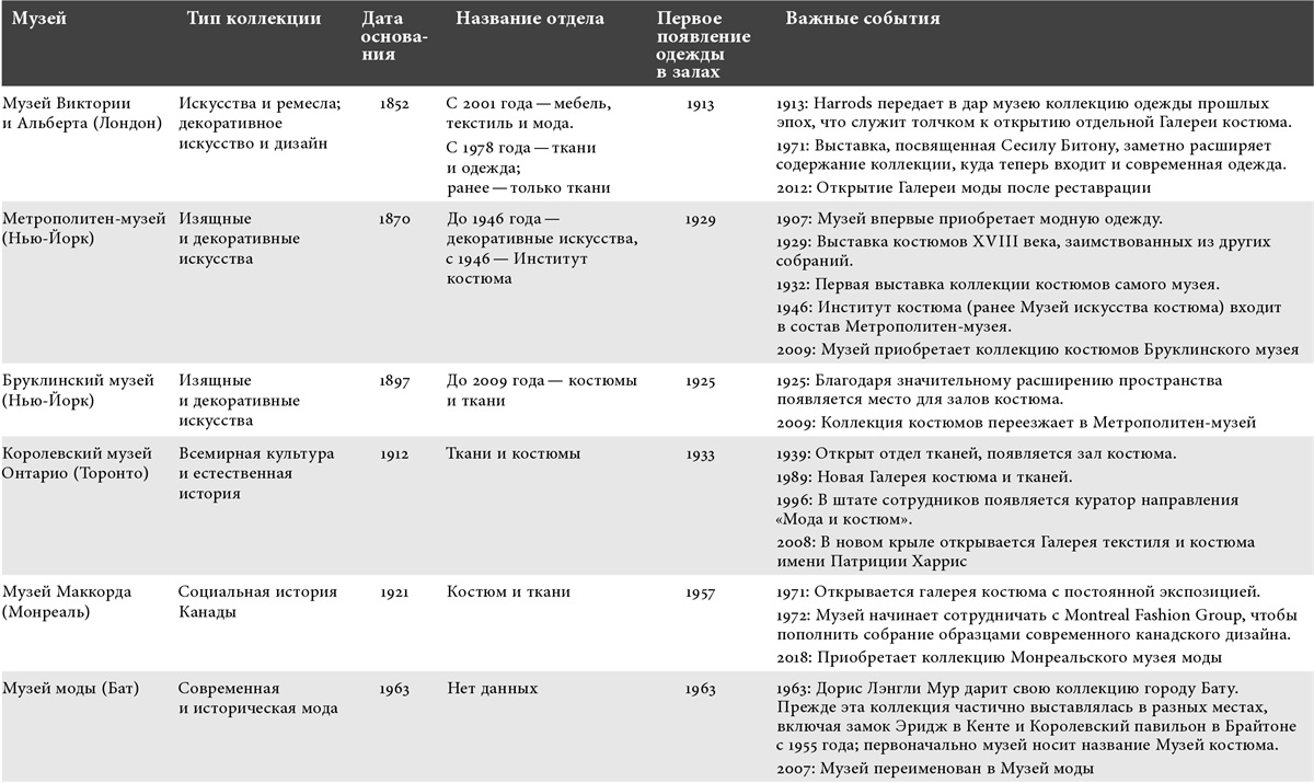 Мода в музеяхВ таблице 1.1 коротко изложен процесс проникновения моды в собрания и экспозиции крупнейших музеев, исследования которых легли в основу этой книги. С первого взгляда очевидно, что мода присутствовала в музее еще до Второй мировой войны, но во второй половине ХX века персонал, бюджет и музейное пространство, выделенные для этого направления, начали существенно расширяться. Лидировали на поприще моды английские коллекционеры и музеи, ненамного отставали от них американские коллеги. В музеях Канады, вероятно, в силу меньшей численности населения, большей консервативности общества и отсутствия развитой местной модной индустрии, залы, посвященные моде, открылись относительно поздно.