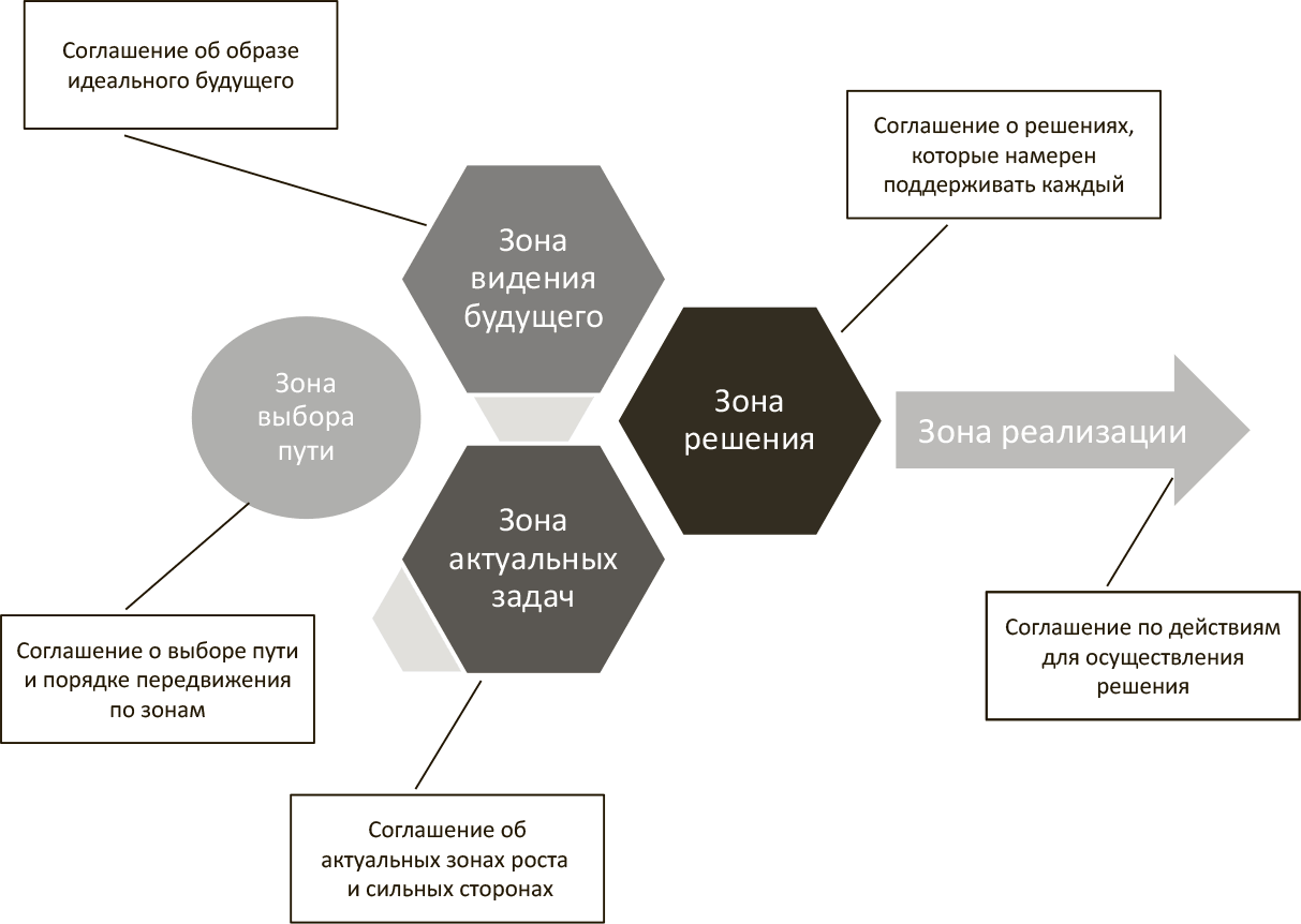 В профессиональном сообществе фасилитаторов и бизнес-тренеров в настоящее время широко применяется следующая модель проведения сессии организационного развития.