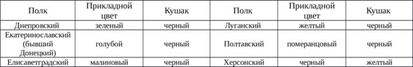 Трубачи: нашивки, какмпрежде, на рукавах кафтана (у Елисаветградского пмолка тесьма желтая с красными полосами поперек наискось).