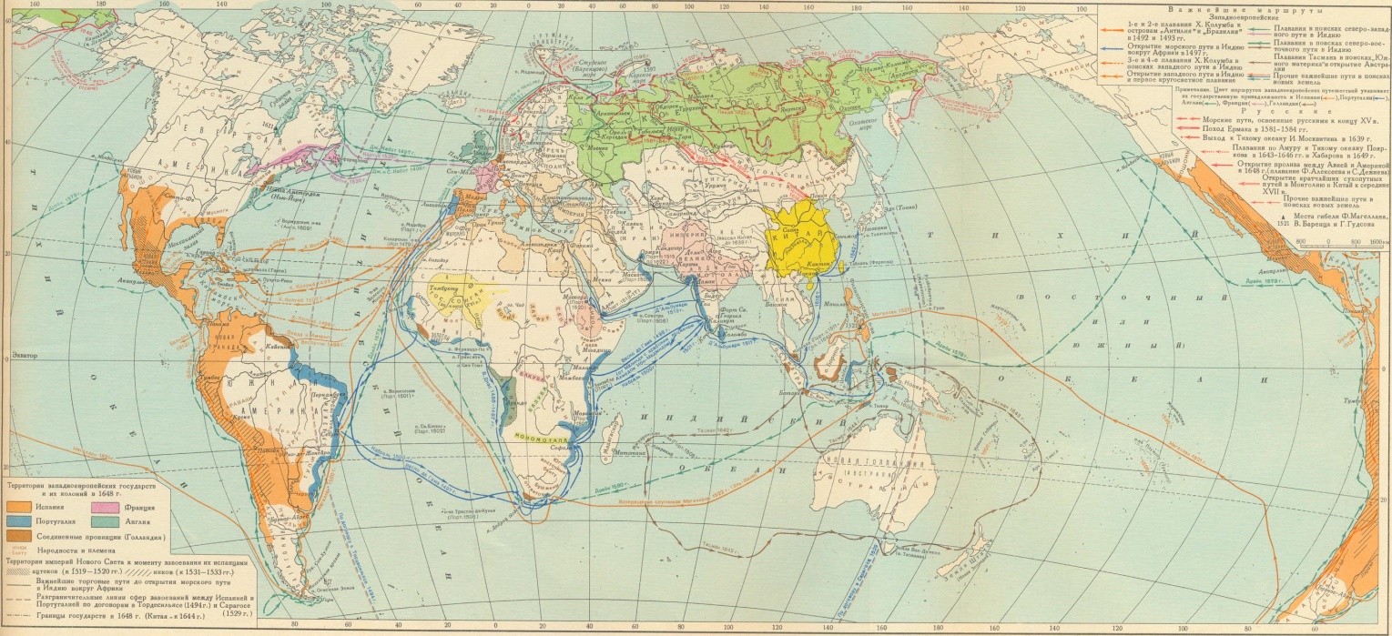 На карте видны огромные территории, на которые простиралась империя Карла V, данные территории достались ему преимущественно путем удачных династических браков его предков – Габсбургов. Именно при Карле V европейцы начали активную колонизацию Нового Света и захватили государства Ацтеков и Инков. Были заложены основные принципы европейского колониализма: неравноценная торговля, военная интервенция, эксплуатация местного населения, вывоз ресурсов.