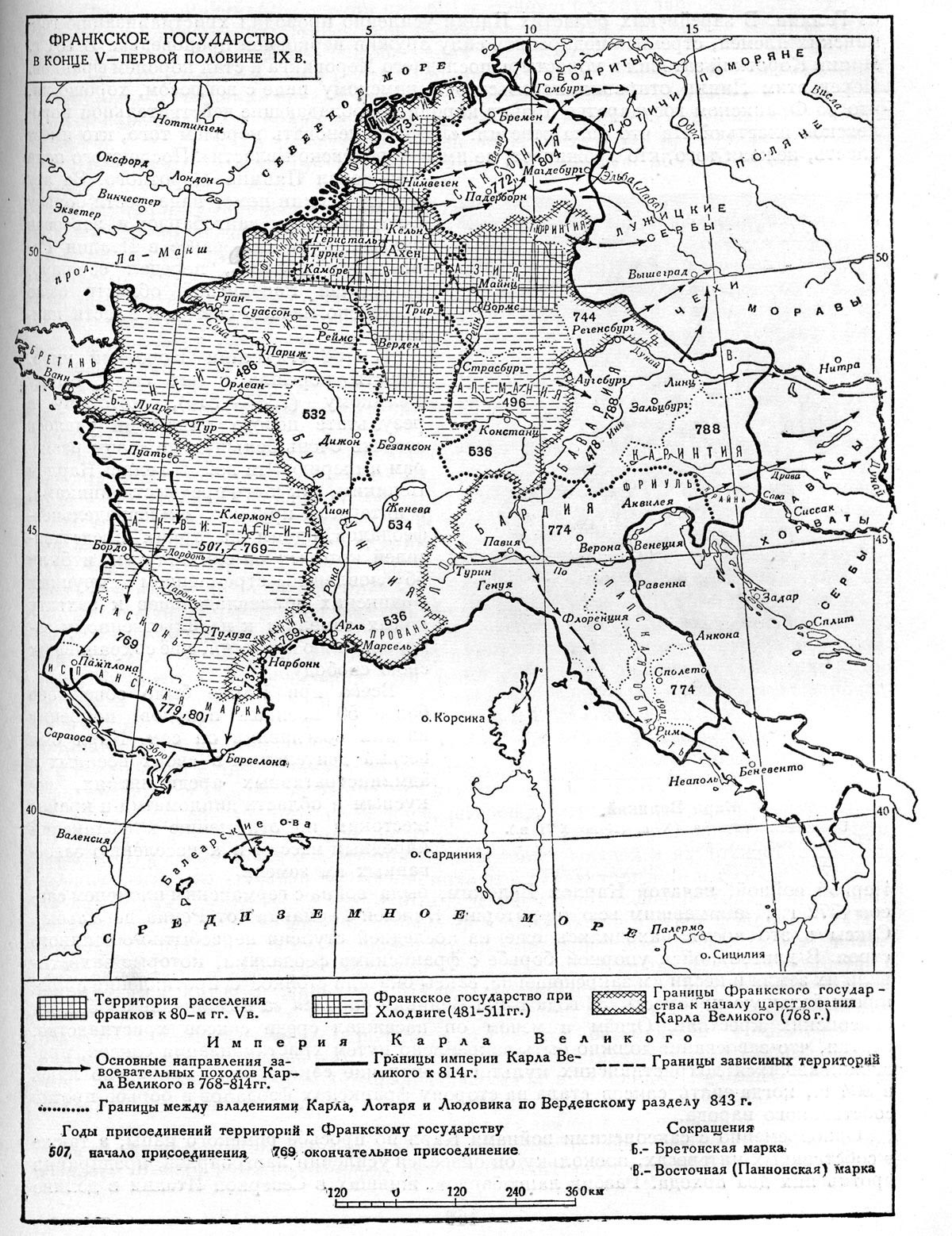Данное государство достигло своего пика при Карле Вели́ком (Карл I; 2 апреля 742/747[1] или 748[2] – 28 января 814, Ахенский дворец) – король франков с 768 года (в южной части с 771 года), король лангобардов с 774 года, герцог Баварии c 788 года, император Запада с 800 года51 (коронован папой Львом III в Риме императорской короной. Именно он подписал «неписаный» договор с церковью на Западе, с самым уважаемым епископом – Папой Римским52. Церковь должна пропагандировать, что власть императора от Бога и что нельзя против нее бунтовать, а император обеспечивает защиту церкви и её материальное благополучие. Данный симбиоз был выгоден всем и служил дополнительным цементом в фундаменте государства Каролингов. Само государство объединило в себе территорию почти всей Западной Римской империи в Европе, за исключением Пиренейского полуострова, где на тот момент правили арабы и господствовал ислам, а также Британских островов, которым повезло, так как Карл Великий был занят войнами на континенте. При этом в империю Каролингов вошли германские земли, которые римляне так и не смогли покорить, с этим все понятно – франки53 сами являлись союзом германских племен.